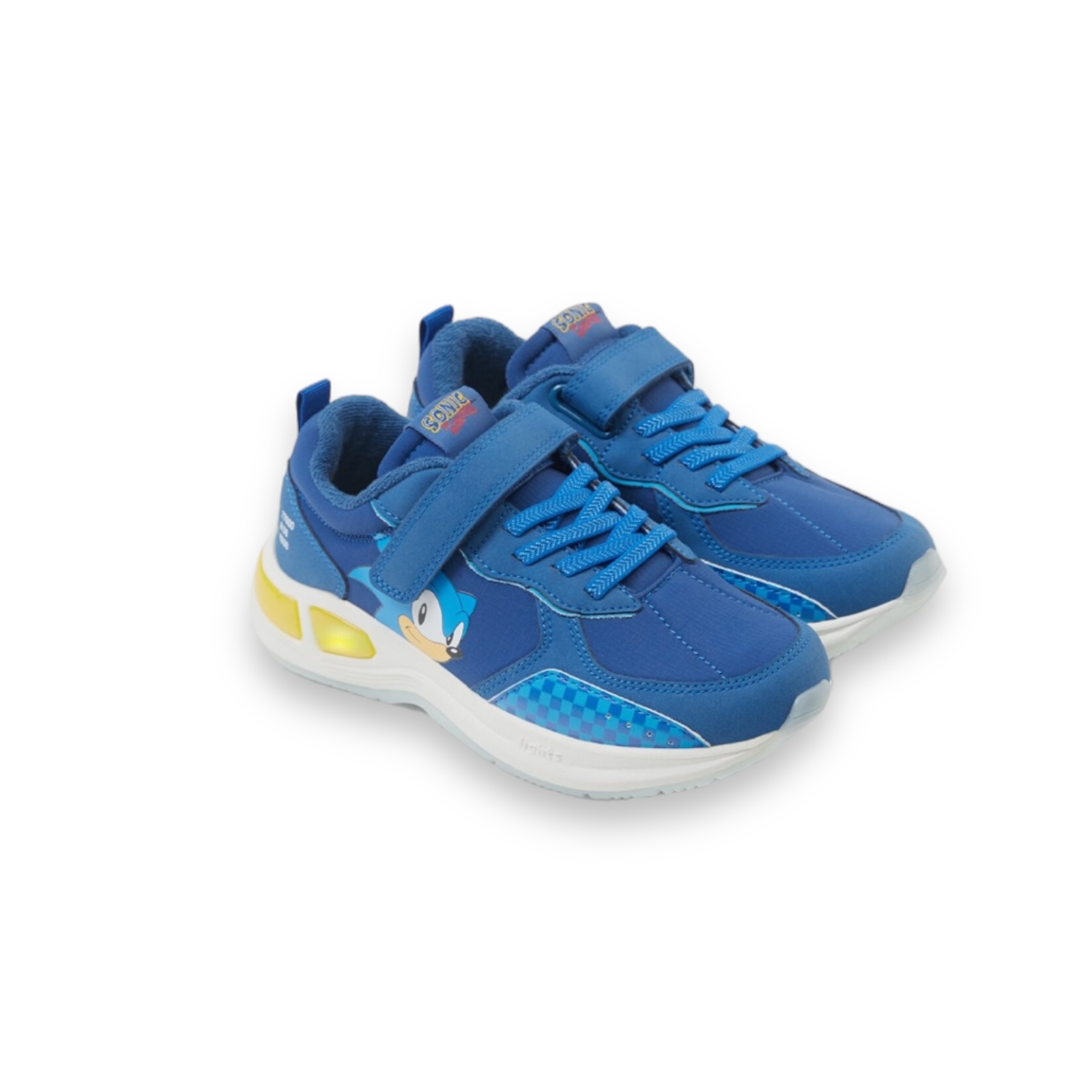Zapato tipo zapatilla deportiva para niño. Detalle luces intermitentes en la suela que se activan con la pisada. Combinación de materiales y colores en corte. Cierre mediante dos tiras adherentes.